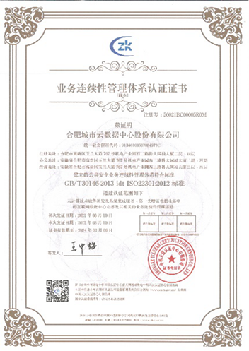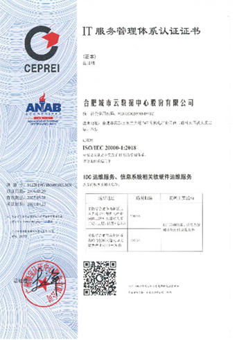 合肥城市云数据中心按照国标(GB50174-2017)A级信息系统机房设计标准建成,并通过工信部机房运行安全评测。数据中心已取得ISO20000、ISO27001、等保合规三级、ITSS云计算服务能力标准符合性证书、国家A级标准数据中心、IDC/ISP许可等认证。